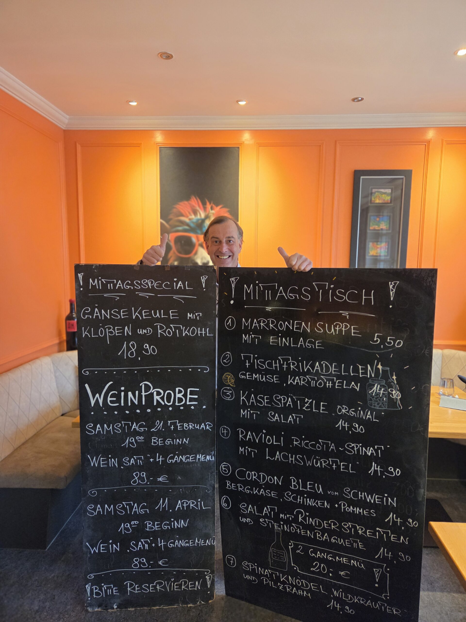 Neuigkeiten im Service Mittags: Wir haben Jens Diegelmann, bekannt aus Jahrzehnte langer Erfahrung mit “Der Sonne”, an Bord geholt. Ab sofort wird unser Mittagsangebot wöchentlich angepasst und auf einer Tafel vor Ort von Jens empfohlen. So gewinnen wir noch mehr Kreativität und regionale Frische in unsere Gerichte – und ihr genießt jede Woche einen abwechslungsreichen Mittagstisch zum fairen Preis.